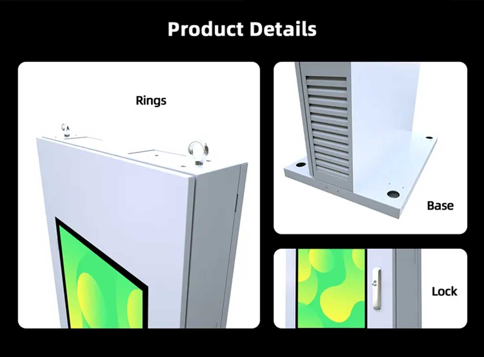 Double-sided Outdoor Kiosk provides a removable base, easy updates, network CMS upgrade, touch screen upgrade, integrated temperature control, waterproof, and sunlight readable screen.